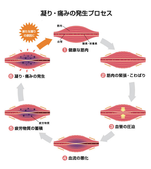 肩こりや腰痛などは、上の図のように筋肉の緊張・こわばりによって血流が悪くなることで起こります。サウナの熱によって全身の血行が改善することで筋肉を流れる血液も増えるため、コリや痛みがやわらぐことがあります。