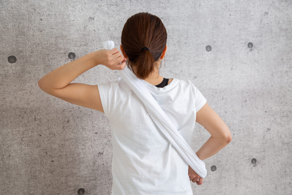 両手にタオルを持って体の後ろに回すストレッチは、肩や背中のストレッチに向いています。この時、肩甲骨を寄せるようにしながら、肋骨が前にですぎないように気をつけましょう。首が前に倒れないように、背筋から1本の先が通っているイメージを持つとより効果的です。